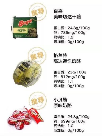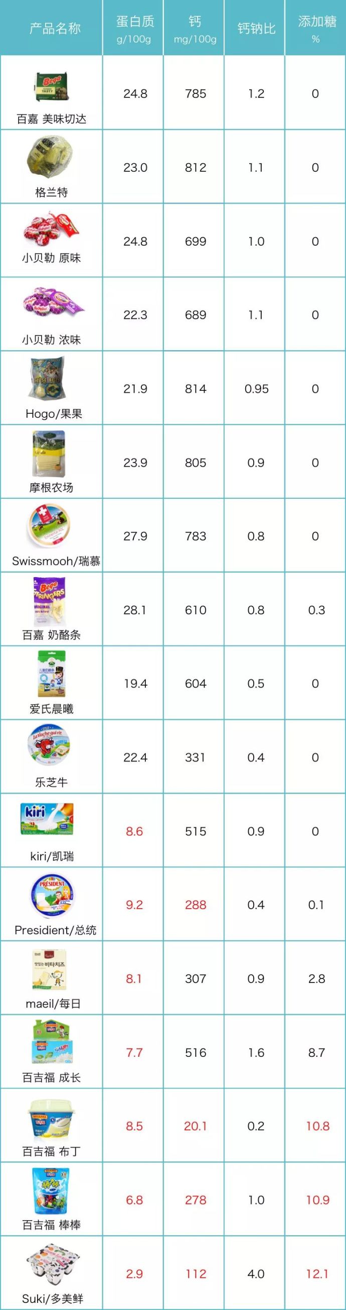 整体来看,符合高钙低钠的一般是天然奶酪,并且天然奶酪成分简单,不含过多食品添加剂,建议首选天然奶酪。另外,我们发现标称“儿童奶酪”的多为再制奶酪,除个别产品外,蛋白质、钙含量普遍偏低、钠却偏高;有的“儿童奶酪”为了迎合宝宝的口味,甚至额外添加糖来调味,如本次评测的百吉福、多美鲜,不建议给3岁以下宝宝吃了。