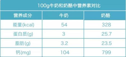 补钙!相比含水量超过80%的牛奶,平均每100g奶酪中钙含量约为牛奶的7.7倍。牛奶和奶酪中营养素含量对比如下图