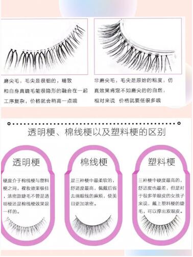 这款是手工假睫毛,摸上去有柔软的感觉,轻盈有弹性,睫毛梗超细透明,隐形效果很好,上眼轻盈自然,非常舒适。
