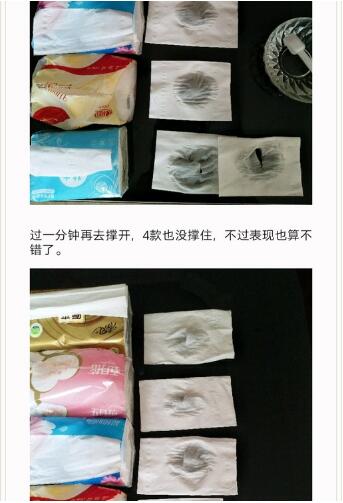 纸坚韧与否,也是影响使用感的重要因素。这里5款都是3层的,测试方法就是洒半勺水上去,用手撑看到底破不破,结果如下(见图四)。第一次洒水后去撑开 ,除了植护秒破,其他4款都坚强的保持完整。过一分钟再去撑开,4款也没撑住,不过表现已很不错了。。