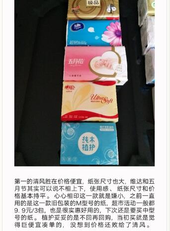 最后总结一下,通过这几个方面的深度测评,清风纸巾完胜,植护垫底,维达和五月花旗鼓相当,心心相印也不错,就是太小了点。好了,就到这儿了,愿能给亲们带来一些启发和指导,祝伙伴们生活愉快!