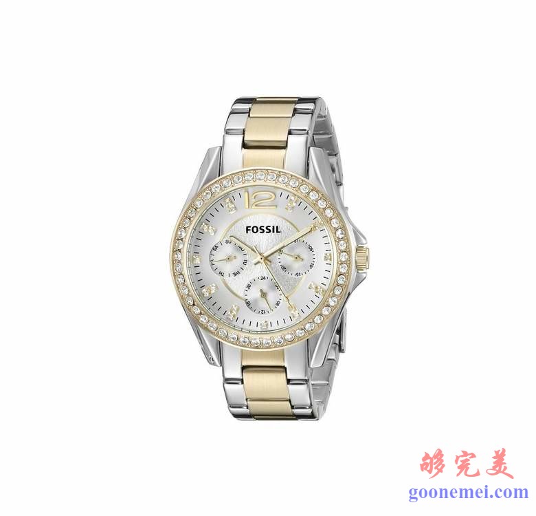 化石在莱利(Riley)创造了令人印象深刻但价格合理的时计。金色和银色边框和表带的组合使它的外观和感觉像是更贵的一块。这款手表具有三个小表盘,分别对应年份,日期和日期。发光的手可以在那些黑暗的地方进行简单的时间检查。水晶镶钻表圈和水晶点缀时标,让您以低廉的价格看上去很豪华。