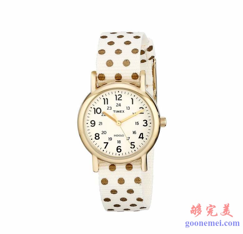 Timex Weekender金色手表使其易于使用。这款表款采用米黄色表盘,配以Indiglo夜灯,易于阅读的数字和24小时跟宗,使转换到军事时间变得简单。