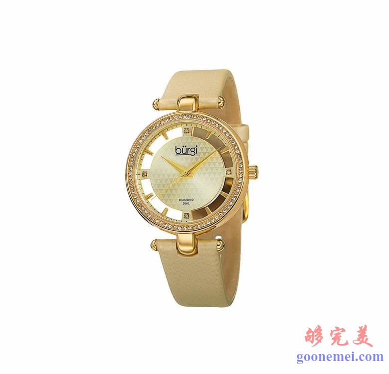 酷炫的peek-a-boo“ See Thru”表盘为这款Burgi手表提供了清晰的计时时间。镶有金色标记的镶钻表圈以及金色时针和分针,给人一种奢华的感觉,奶油色缎面和皮革表带使其更加美味。对于一款显然物超所值的手表,瑞士石英机芯和这款时计的整体质量给买家留下了深刻的印象。Burgi女士手表既优雅又实惠。